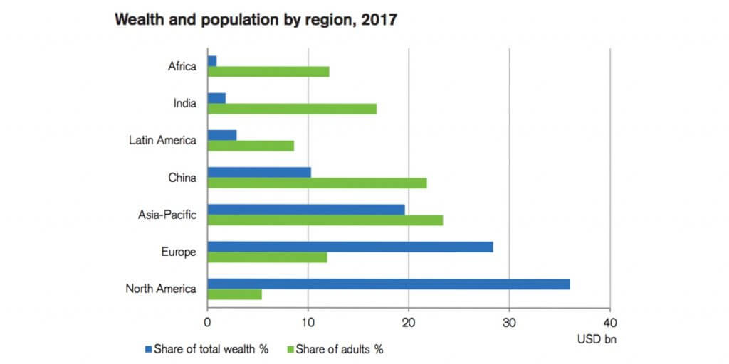 Каждый год я читаю Global Wealth Report от Credit Suisse Research Institute. Отчёт за 2017 год показывает, что на Северную Америку приходится почти половина всего мирового богатства.