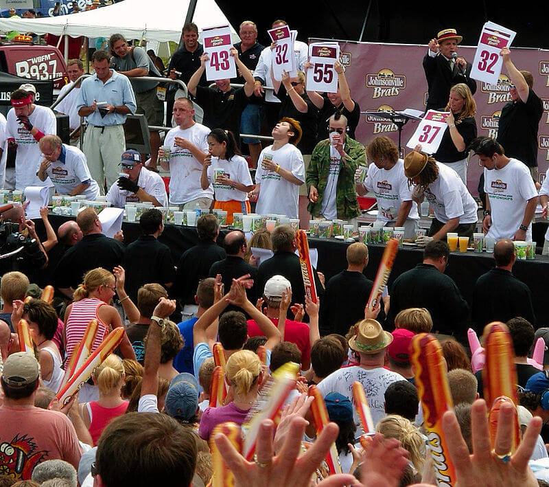 Для рекламы изделия Натан уже 4 июля 1916 года устраивает конкурс по их скоростному поеданию, который с тех пор будет проводиться ежегодно в День Независимости. И если первый его победитель сумел одолеть лишь 10 хот-догов за 12 минут, то в 2016 году был поставлен рекорд — 70 хот-догов за 10 минут.