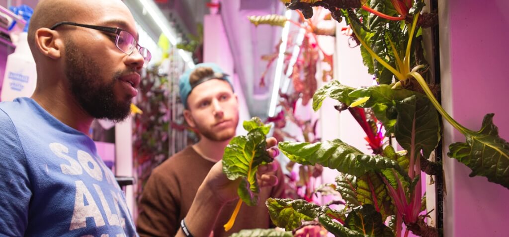 Гидропонная ферма Square Roots представляет собой 10 контейнеров, освещенных фиолетовым, стимулирующим рост светом. Ряды культур в каждом модуле нуждаются только в ежедневном потреблении около 8 галлонов воды для производства более 50 фунтов зелени салата каждую неделю. Свежая продукция распространяется среди малообеспеченных сообществ.