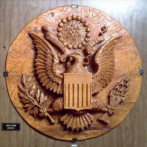 Кстати, коль мы уже коснулись с вами аспектов «холодной войны» с Россией, то хотелось бы напомнить вам историю, косвенно связанную с Гербом, и начавшуюся в 1945г. в пионерском лагере Артек, в то время праздновавшем своё 20-тилетие в Советском Союзе. На нём советские пионеры подарили американскому послу А. Гарриману деревянную копию американского герба, выполненную из самых элитных сортов древесины. Этот, удивительной красоты подарок, был размещён затем на стене в кабинете посла в Москве, и провисел там 8 лет. С вмонтированным в него передающим устройством, пережив при этом четырёх послов. И хотя каждый вновь назначенный глава американской дипмиссии в Москве полностью менял интерьер кабинета, но герб продолжал всё это время оставаться на своём месте. Его художественное совершенство действовало на американцев гипнотически, а многочисленные проверки не обнаруживали в нём наличия металла, а дерево не являлось проводником сигнала. Вмонтированный в него чудо-микрофон, не имевший аналогов по своим техническим свойствам, американцы обнаружили совершенно случайно, поскольку это подслушивающее устройство не имело источника питания и передатчика. Работало оно лишь тогда, когда облучалось мощным источником, который находился в 300м., в доме напротив посольства. Это унизительное происшествие американцы потом ещё семь лет хранили в тайне.