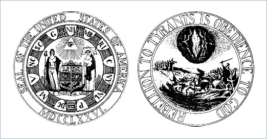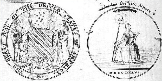 Всем известна дата — 4 июля 1776 года — день принятия Декларации независимости США. Сразу же после этого, Континентальному Конгрессу полагалось срочно решить вопросы о национальной атрибутике нового государства, подтверждающей его суверенитет. В первую очередь о Большой печати. Эта работа была поручена трём наиболее уважаемым его членам: Джону Адамсу (в последствии – 2 президенту США), Томасу Джефферсону (перенявшему у него этот пост) и Бенджамину Франклину (мог быть избранным, но в 1790 году ушёл из жизни). Каждый из них предложил свой вариант дизайна. Б. Франклин, обратившийся к библейскому сюжету, провел параллель между освобождением американского народа от заморского ига с историей исхода евреев из Египта. Герб США по этой версии венчал девиз «Восстание против тирании — в воле Божией». Т. Джефферсон, аналогично ему, увидел в акте суверенитета народ Израилев, ведомый Моисеем в землю обетованную. Вариант Дж. Адамса был обращён к древней истории. Он предложил на аверсе изобразить обнаженного Геркулеса, опирающегося на дубину, а на реверсе – слегка одетых Добродетель, указывающую на дорогу восхождения, и Лень, предлагающую возлечь на лужайке среди цветов. Кстати, уже здесь, в самых первых предложениях о печати, которая должна была использоваться для подтверждения подлинности документов правительства страны, она, в отличии от всех печатей мира — предусматривалась двухсторонней. Скорее всего оттого, что у отцов основателей было так много идей, что они не укладывались в одностороннее изображение. Поэтому эту, оборотную сторону печати, иногда называют ее духовной составляющей. В реальности двусторонняя печать США никогда не изготавливалась, а реверс существовал лишь на бумаге. Поскольку никто из троих авторов не умел рисовать, было решено пригласить человека, который бы не только умел это делать, но к тому же и разбирался в геральдике. Так в комитет вошел художник Пьер Эжен ду Симитьер. В августе 1776 года он представил свое творение в Конгресс. На реверсе он изобразил всё, что придумал Франклин (Моисей и тонущие воины фараона), а на аверсе был нарисован щит с эмблемами шести европейских культур, мигрировавших в Америку: Англии, Шотландии, Ирландии, Франции, Германии и Голландии. Но ни один из профессионально выполненных им рисунков не был принят конгрессом.