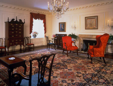 Комната кабинета (Cabinet Room) – уже само её название указывает на то, что она является своеобразным местом встреч и заседаний министров, секретарей кабинета и советников, служащих президенту Соединенных Штатов. Она также расположена в западном крыле Белого дома и, примыкая к Овальному кабинету, выходит своими окнами на Розовый сад. Комната завершена строительством в 1934 году и выполнена в георгианском стиле. Интересно, что спинка установленного здесь президентского кресла на два дюйма выше спинок кресел остальных членов кабинета. У каждого заседающего в этой комнате есть свое именное кресло, на спинке которого привинчена бронзовая табличка с именем и должностью хозяина. Так, на президентском стуле можно прочесть «Президент». Кстати, после того как члены правительства оставят свой пост, они могут забрать кресло с собой. Но не бесплатно. Его следует выкупить. Правда, чаще всего это делают бывшие сотрудники босса, в знак благодарности. И ещё одно. Места всех членов кабинета строго регламентированы. Так, вице-президент США всегда сидит через стол, строго напротив президента. Госсекретарь — только справа, а министр обороны — только слева от главы государства.