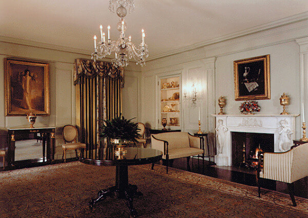 Зелёный зал (Green Room). Его использует для встреч и небольших приёмов. Когда-то являлась столовой Томаса Джефферсона, а теперь меблирована как кабинет. Почти вся мебель была произведена в Нью-Йорке Дунканом Файфом в 1810 году. Стены украшены зеленым шелком с волнистым рисунком, напоминающим рисунок дамаска или булата. Каминная полка из итальянского белого мрамора была приобретена в 1818 году для Государственной столовой и перенесена сюда в 1902-м. В этой комнате находится и кофейник, принадлежавший Джону Адамсу. По бокам от него –два подсвечника, использовавшиеся Джеймсом Мэдисоном. В 2007 году интерьер обновили под руководством первой леди Лоры Буш: стены оклеили шёлком, кирпичную обивку кресел заменили на алую. Турецкий ковёр, постеленный при Никсоне, заменили новым в стиле французского савонри.