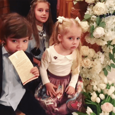 На венчании также присутствовали совместные дети-двойняшки — Лиза и Гарри. Всю церемонию они сидели на стульчиках и крестились.