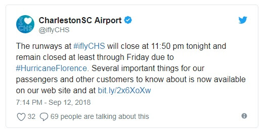 Международный аэропорт Чарльстона написал в Твиттере, что взлетно-посадочные полосы закрываются до полуночи в среду и остаются закрытыми «по крайней мере, до пятницы» из-за урагана.