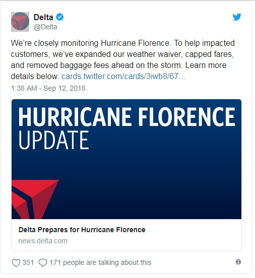 Различные перевозчики отказались от сборов за рейсы, траектория полетов которых пересекалась с ураганом. American Airlines, Delta Air Lines, Southwest Airlines и United Airlines являются одними из основных перевозчиков, которые отказались от сборов за тех, кто путешествует по юго-востоку на следующей неделе.