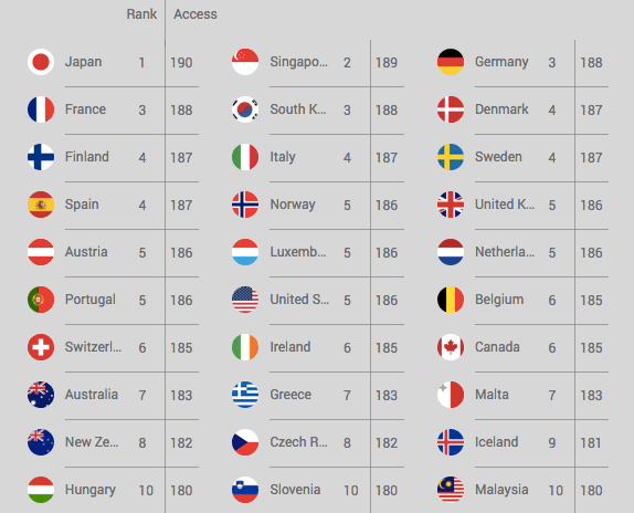 Первое место занял паспорт Японии, с его помощью японцы могут посещать без визы 190 стран мира — это рекордный показатель для «Индекса», отметили аналитики, по словам Vc.ru. Стране удалось обогнать Сингапур (189 стран с безвизовым посещением), получив безвизовый доступ в Мьянму.