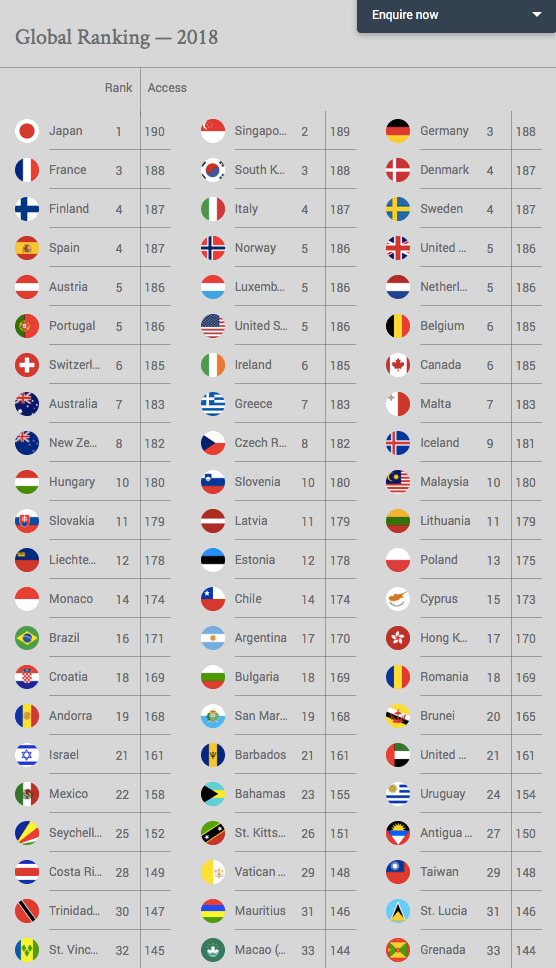 Компания Henley & Partners, которая помогает частным клиентам выбрать страну проживания, представила «Индекс паспортов-2018». Он включает в себя список стран, расположенных по уровню свободы передвижения, которую они предоставляют своим гражданам.