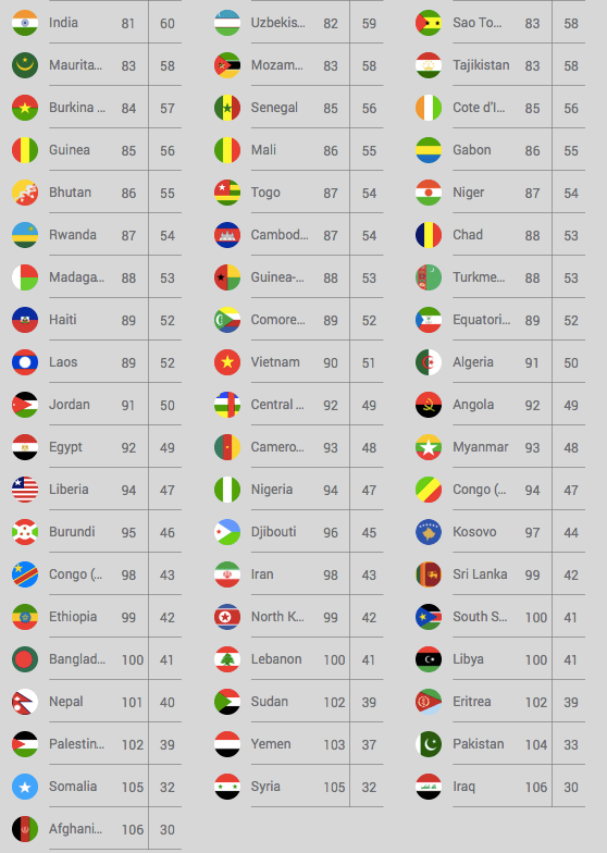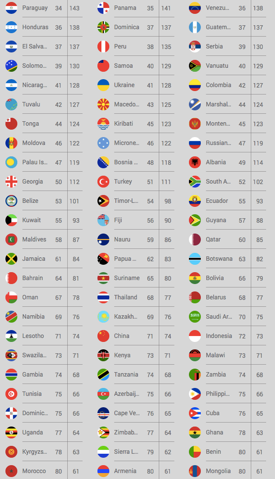 Третье место занимают Германия, Южная Корея и Франция (188 стран). На четвертом расположились Дания, Италия, Испания, Финляндия и Швеция (187 стран).
