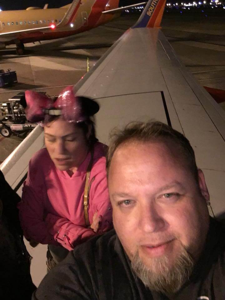 На фото мужчина находится на переднем плане, а за ним его жена — женщина в розой кофте и с ушами сказочного героя Мини. Пассажир рассказал, что возвращался из отпуска, где они праздновали день рождения жены. Фото он подписал так: «Мне пришлось выскочить в аварийную дверь и вылезти на крыло, а затем нас попросили вернуться, чтобы спуститься вниз».