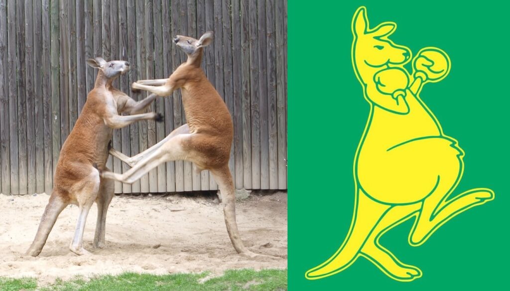 А национальные сборные Австралии по футболу, теннису и крикету используют в своей атрибутике национальный символ – «Боксирующего кенгуру». Столь странному названию он должен быть благодарен самим кенгуру, которые во время схватки с противником отталкивают его передними лапами, а более мощными задними — наносят сокрушающие удары, от которых противник получает серьёзные повреждения или даже погибает. Вид такого боя создает впечатление, будто бы кенгуру «боксирует» — отсюда и появился знаменитый образ «боксирующего кенгуру». Вначале его начали использовать бродячие артисты и циркачи. Затем он стал эксплуатироваться в немом кино и многочисленных мультфильмах, окончательно связавших его с Австралией. Во время второй мировой войны «боксирующий кенгуру», благодаря своим качествам: умению держать удар, стойкости и готовности одержать победу, стал символом Королевских военно-воздушных сил Австралии, появившись на фюзеляжах самолётов. Позднее эту символику задействовал и Королевский военно-морской флот.