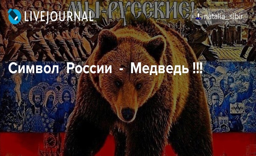 Однако в такого типа символике для нас с вами наиболее интересна фигура Русского медведя — олицетворяющая Россию. Она существовала в национальном фольклоре с незапамятных времён. Наравне с зайцем-трусишкой, хитрой лисой, злобным волком и т.п.