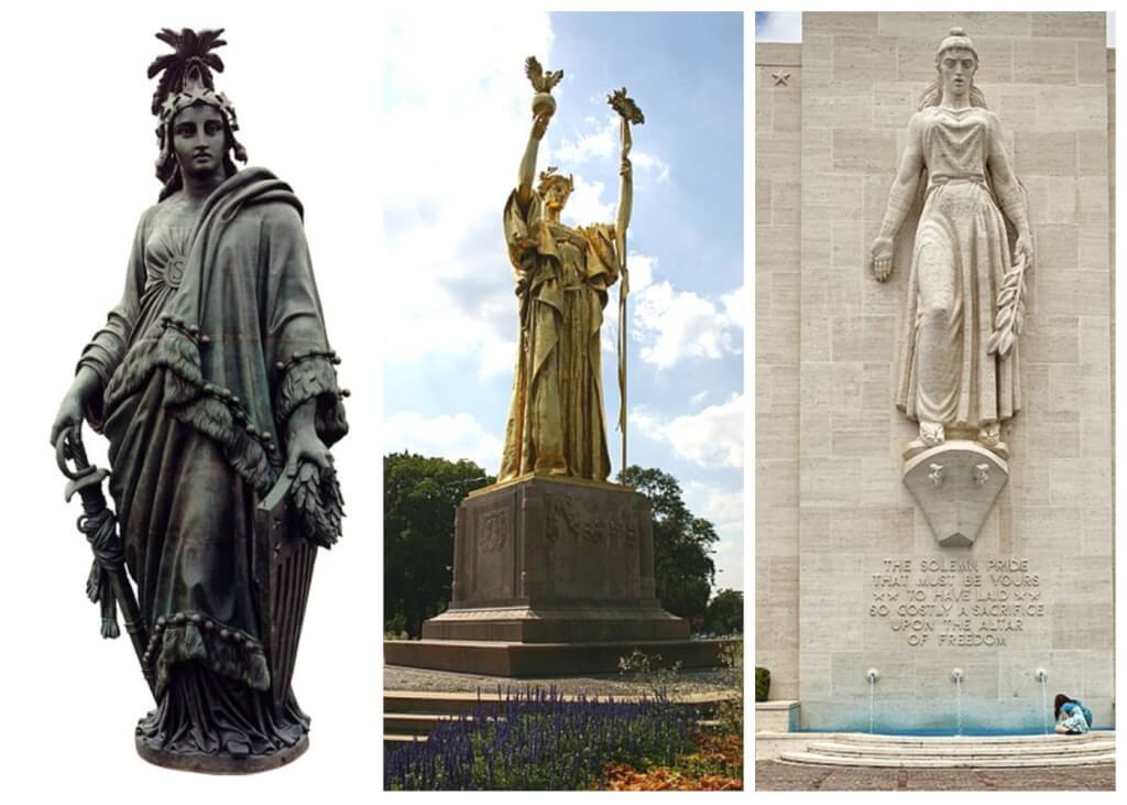 Так же отличаются и скульптурные изображения женского символа страны: от гордой воительницы и защитницы, чья шестиметровая фигура венчает купол здания Капитолия в Вашингтоне, и фигуры триумфатора и победительницы, т.н. «Золотой леди», установленной в парке Jackson в Чикаго, до скорбящей о своих погибших сыновьях на кладбище National Memorial Cemetery of the Pacific в Гонолулу на Гавайях.