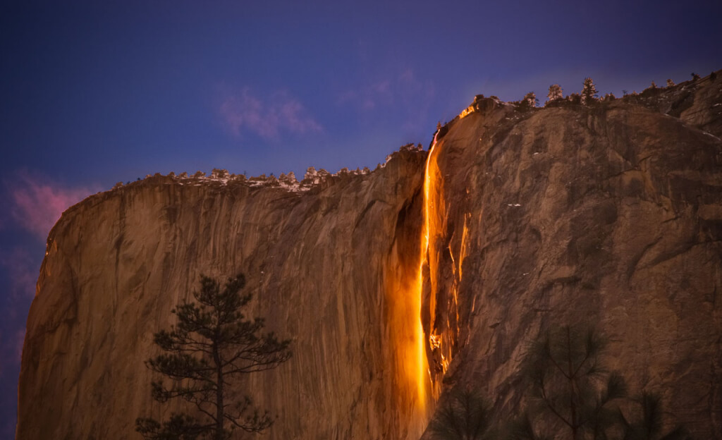 Желтый, оранжевый, красный цвета, в которые окрашивается водный поток Хорстейл — это зрительный обман природы, феномен, связанный с преломлением света. Вода становится огненной и кажется, будто горную гряду Эль-Капитан охватило пламя.
