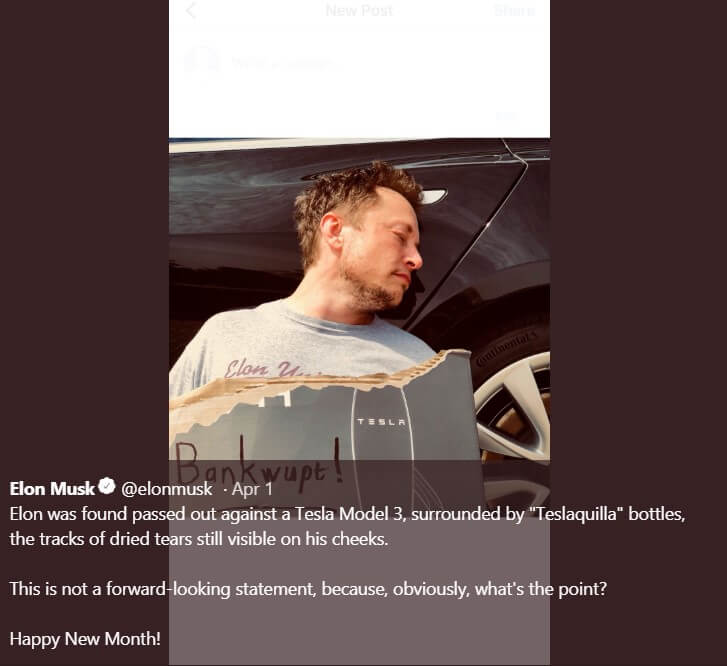 Первого апреля основатель Tesla шутя объявил в Твиттере о банкротстве компании и опубликовал свое фото с подписью: «Илон был найден без сознания в окружении бутылок Teslaquila и со следами высохших слез на лице». Банкротство не состоялось, а вот шутка о текиле, похоже, воплотится в жизнь.