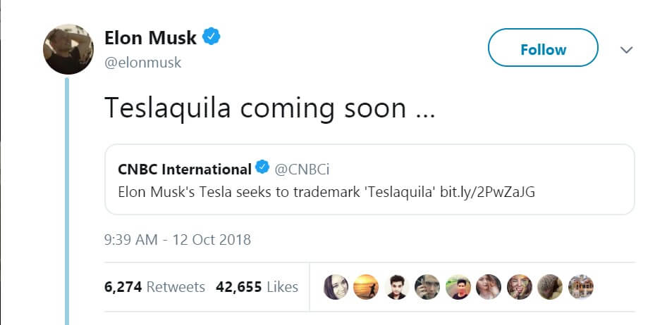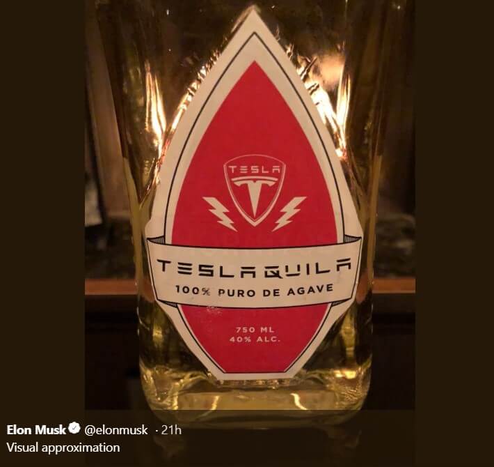 На днях Илон Маск опубликовал снимок бутылки с текилой, на которой была наклеена этикетка новой торговой марки, и сообщил, что Teslaquila «ожидается».