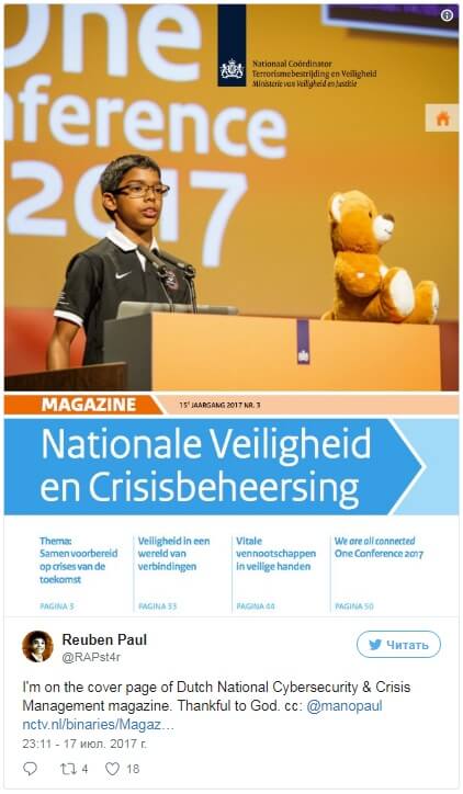 Как пишет Share America, в cвои 11 лет Рубин знает о безопасности в интернете больше, чем большинство взрослых. Он выступал в качестве основного докладчика на недавно состоявшейся в Гааге международной конференции International One Conference-2017 и удивил зрителей, продемонстрировав, как легко “умные” игрушки, подключенные к интернету, могут быть использованы для кражи конфиденциальной информации.