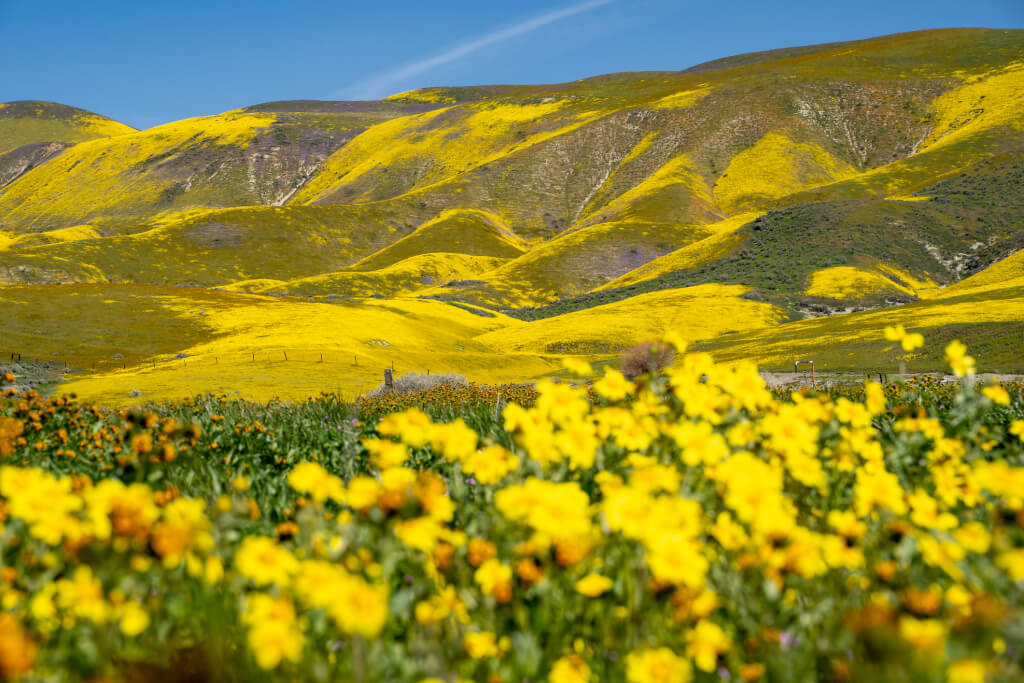 Это огромная, почти дикая равнина в юго-востоке округа Сан-Луис-Обиспо, зажатая между двумя хребтами — Темблор и Кальенте. В 2026 году цветение здесь началось очень рано — уже в начале февраля, благодаря тёплой зиме и хорошим дождям. Долина превратилась в сплошной ковёр оранжевых и жёлтых цветов, который резко контрастирует с тёмными горами вокруг — зрелище по-настоящему эпичное.