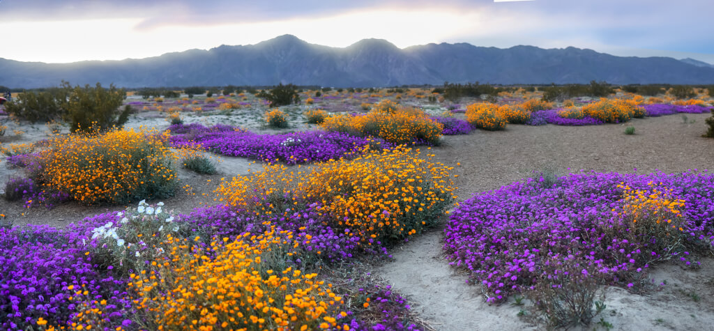 Самый большой государственный парк Калифорнии — настоящая пустыня, которая после дождей оживает и покрывается сотнями видов цветов. В этом году особенно красиво цветут кустарники, разные кактусы (fishhook, barrel, cholla), создавая яркие пятна на фоне скал, каньонов и сухих русел.
