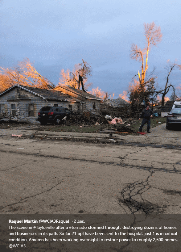 По данным Иллинойсской компании по электроснабжению и доставке топлива Ameren и CTI Fiber Network, более 2000 человек в Тейлорвилле остались без электричества.