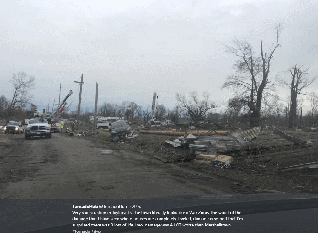 Самый сильный удар стихии пришелся на город Тейлорвилль, расположенный примерно в 30 милях к юго-востоку от столицы Спрингфилда. Сильные порывы ветра разрушали дома, срывали линии электропередач и вырывали с корнями деревья.