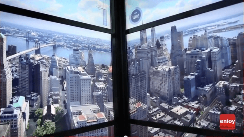Выдающиеся события 19-го и 20-го веков пробегают перед глазами пассажира пока он поднимается на самый верх. Рядом появляются башни-близнецы и потом исчезают. Неожиданно посетитель видит металический каркас и он оказывается якобы в шахте лифта.