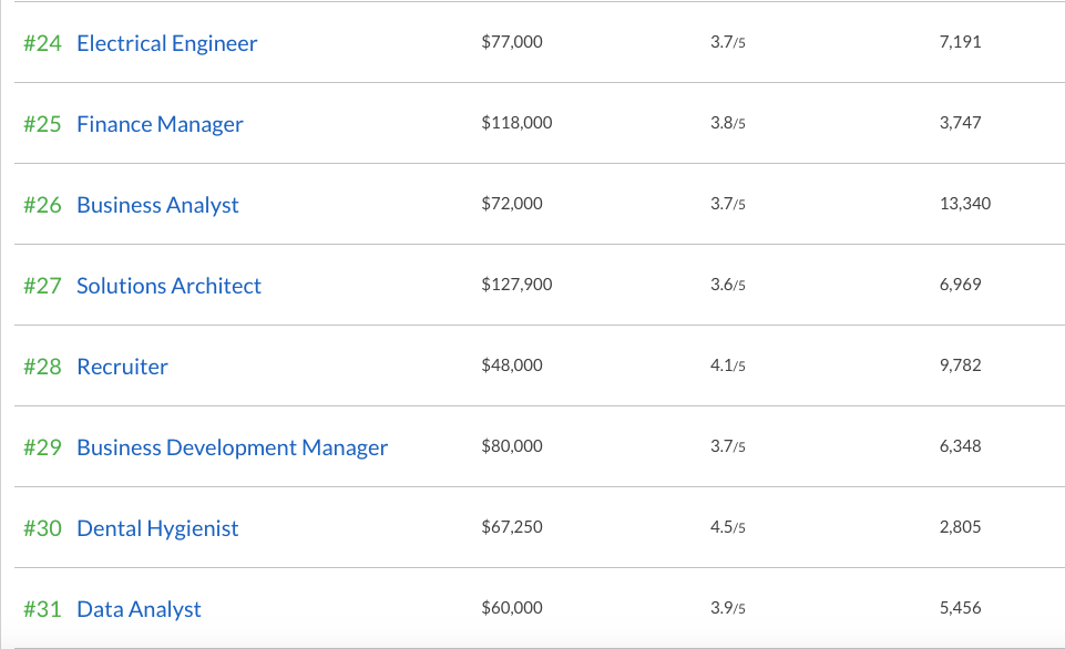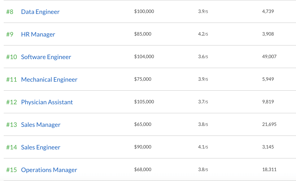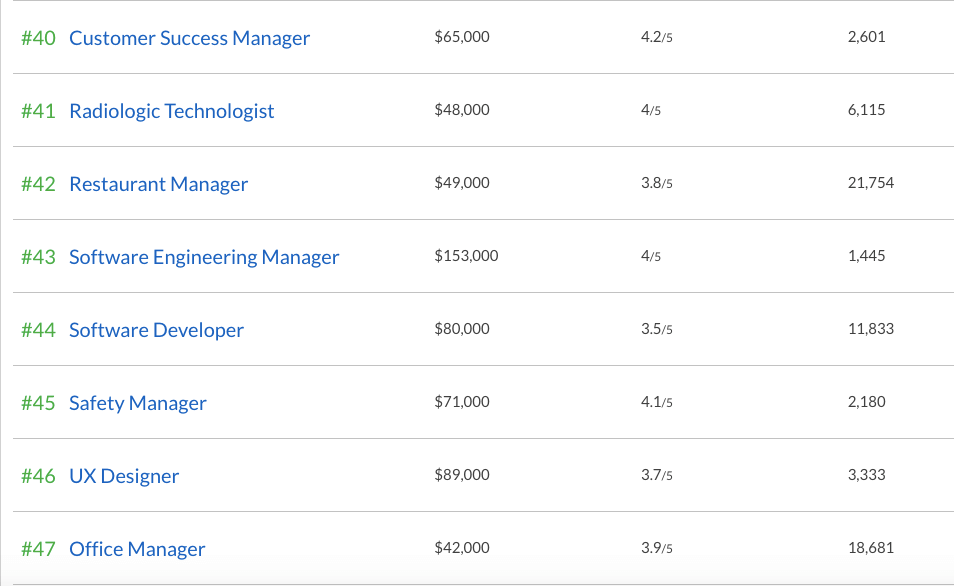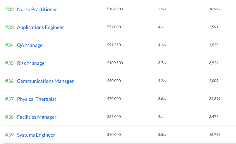 Рейтинг базируется на нескольких критериях: заработной плате, удовлетворению работой среди тех, кто занимает эти должности, и количеству открытых вакансий.