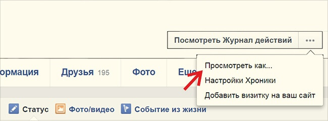 Если вы хотите знать, как выглядит ваш профиль для тех, кто не является вашим другом, нажмите на три точки справа от команды «Посмотреть журнал действий» и выберите «Просмотреть как…» Это даст вам отличную возможность взглянуть на свою страницу глазами незнакомых вам людей.