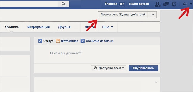 В Фейсбуке у вас есть возможность просмотреть все, что вам когда-либо нравилось, было прокомментировано или опубликовано вами. Просто нажмите на перевернутую вниз стрелку в правом верхнем углу вашей страницы и выберите «Журнал действий».