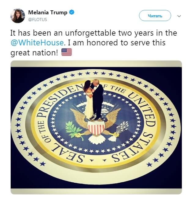 Так первая леди Мелания Трамп написала в твиттере: «Два года были незабываемыми в @WhiteHouse». Для меня большая честь служить этой великой нации!».