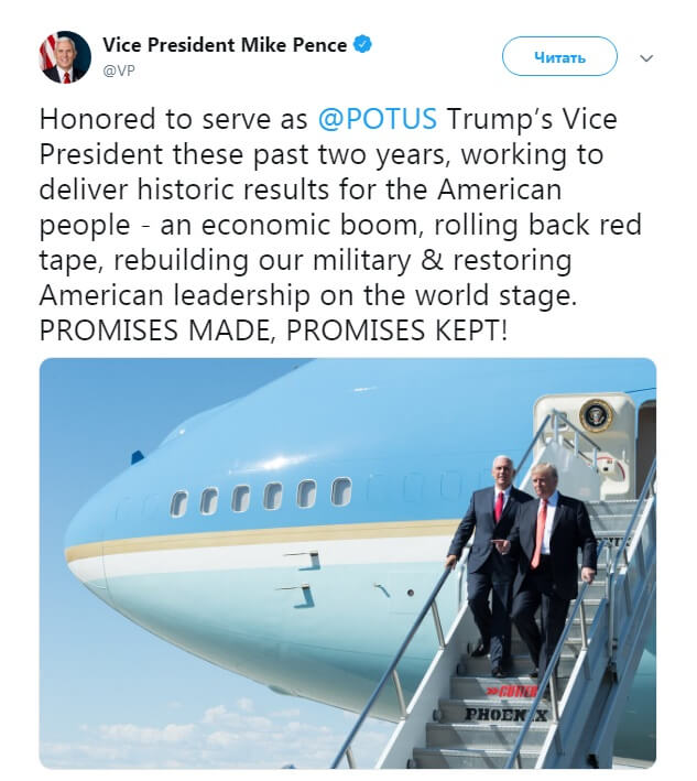 Вице-президент Майк Пенс написал в Твиттере: «Для меня большая честь служить вице-президентом @POTUS Trump в течение последних двух лет, работая над тем, чтобы обеспечить исторические результаты для американского народа — экономический бум, уменьшение бюрократизма, восстановление нашей армии и американского лидерства в мире. ОБЕЩАНИЯ ВЫПОЛНЕНЫ. ОБЕЩАНИЯ СДЕРЖАНЫ!».