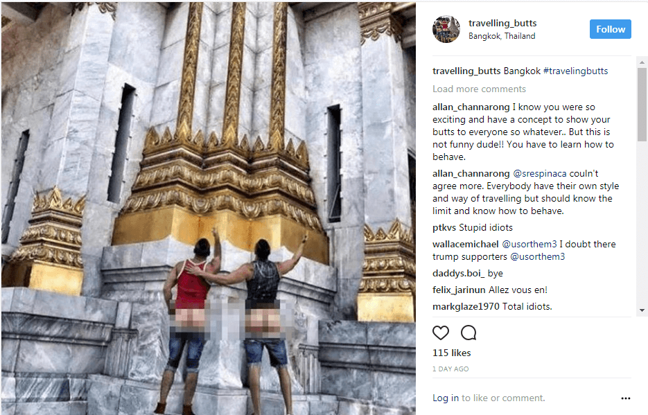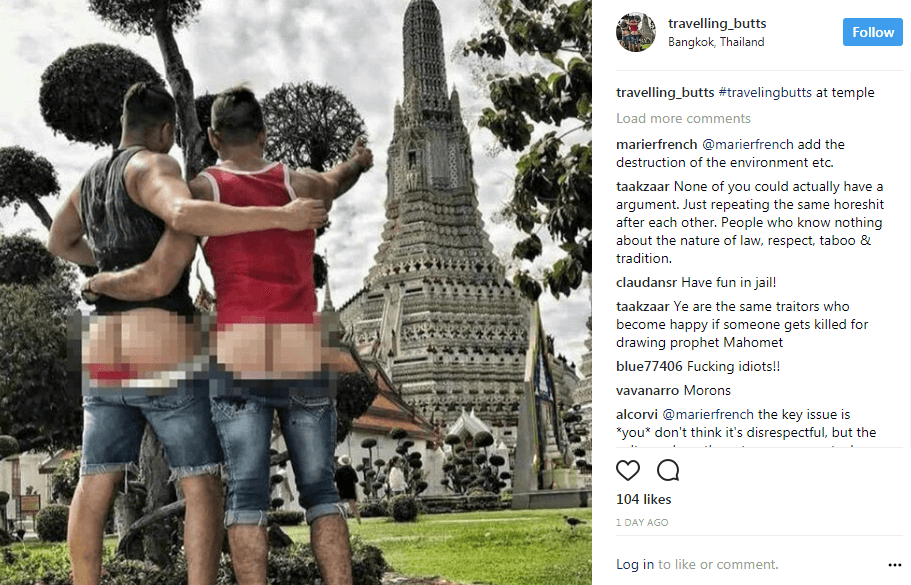 В Таиланде двум американским туристам из Сан-Диего, супругам 38-летнему Джозефу и 36-летнему Трэвису Дасилва грозит от 5 до 7 лет тюремного заключения за фотографию с обнаженными ягодицами на фоне храма Ват Арун в Бангкоке.