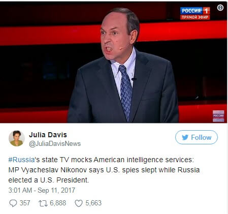Вячеслав Никонов, член нижней палаты российского парламента — Думы — сделал громкую ссылку на вмешательство России на выборах в США в 2016 году в воскресенье, 10 сентября, во время еженедельного политического шоу под названием «Воскресный вечер с Владимиром Соловьевым».