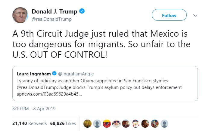 На своей странице в Твиттере глава Белого дома написал: «Судья 9-го округа постановил, что Мексика слишком опасна для мигрантов. Так несправедливо для США. Ситуация вышла из-под контроля!».