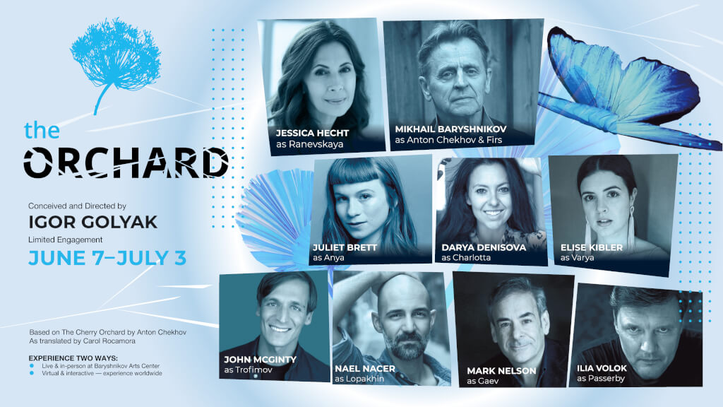 Спектакли The Orchard в Центре Барышникова в Нью-Йорке проходят в рамках ежегодного фестиваля «Вишневый Сад», который в этом году празднует 10-летие. Спектакли проходят ежедневно, кроме понедельника, до 3 июля 2022 года по адресу BARYSHNIKOV ART CENTER (BAC), 450 W 37th St, New York, NY. Билеты можно заказать на сайте фестиваля cherryorchardfestival.org или https://www.theorchardoffbroadway.com.