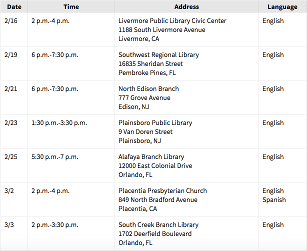 Все сессии являются бесплатными, они проводятся на английском и испанском языках в разных частях США.
