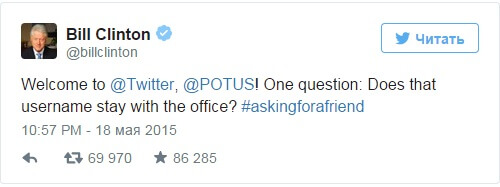 «Добро пожаловать в Twitter, @POTUS! Один вопрос: этот ник останется при администрации [президента]?» — написал он, используя свой аккаунт в сервисе микроблогов. При этом в сообщении он добавил хэштег #askingforafriend («спрашиваю для друга») с намеком на то, что этот аккаунт может понадобиться его жене Хиллари Клинтон в случае ее победы на президентских выборах 2016 года.