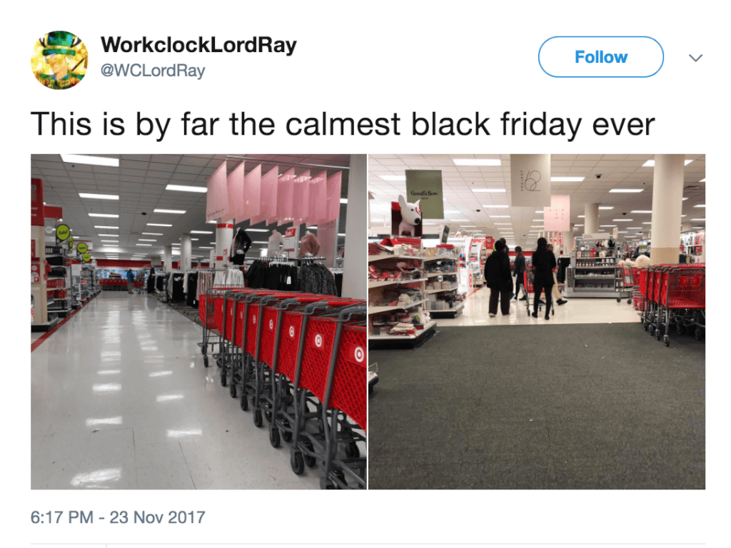 Магазины рано открыли свои двери, чтобы избежать давки и паники среди покупателей, но это помогло не во всех магазинах. Так, например, в магазине Buckle в Гувере, штат Алабама арестовали двух женщин, которые устроили драку. В Миссури выстрелили в 19-летнего парня вне стен торгового центра. Он госпитализирован и находится в тяжелом состоянии. Тем не менее, в большинстве магазинов покупки обошлись без таких инцидентов.