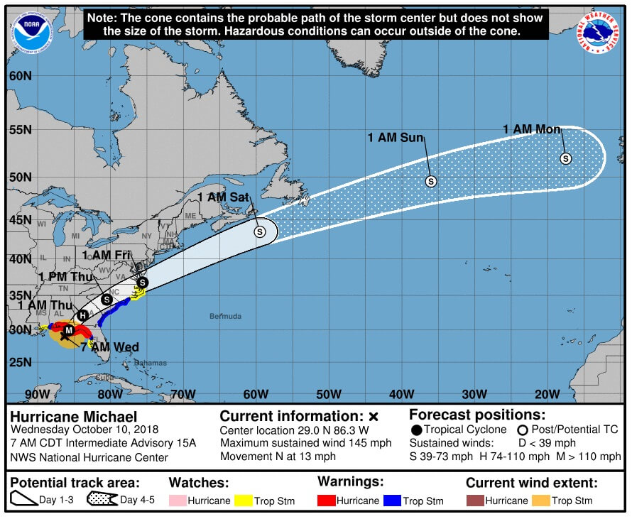 Скорость ветра внутри урагана достигает 220 километров в час, и ожидается, что он достигнет побережья к полудню среды по местному времени. Синоптики ожидают, что Майкл обрушится на побережье региона Панхендл.