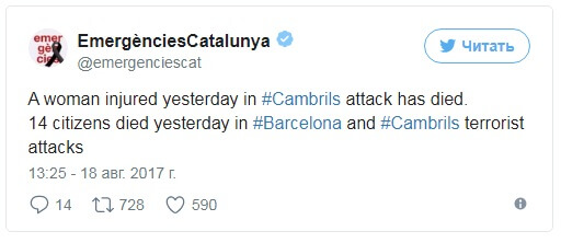 Число жертв терактов в Барселоне и Камбрильсе достигло 14 человек. Ранее сообщалось о 13 жертвах, однако утром 18 августа умерла женщина, которая пострадала при наезде автомобиля на пешеходов на побережье Камбрильса, сообщается в Твиттере экстренных служб Каталонии.