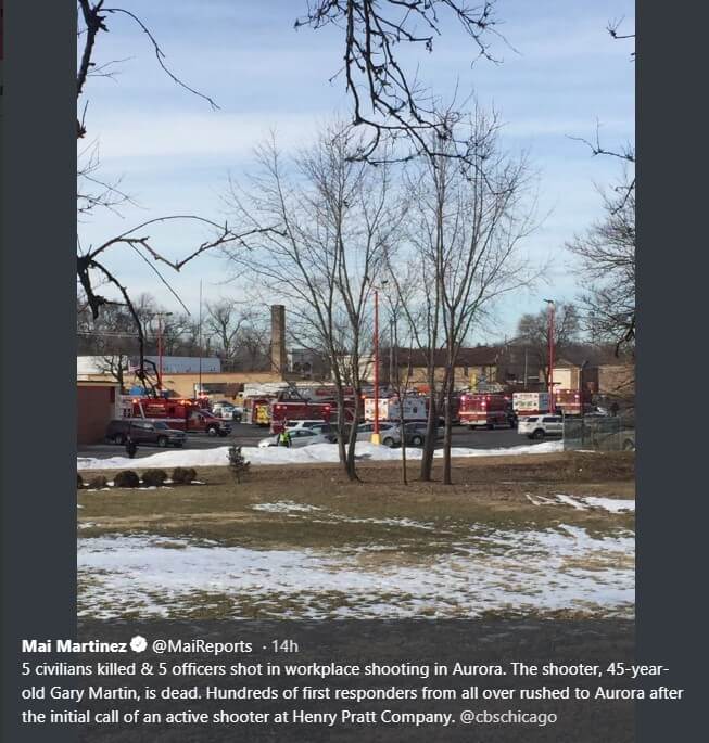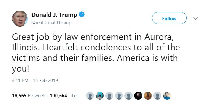 «Отличная работа правоохранительных органов в Авроре, Иллинойс. Сердечные соболезнования всем жертвам и их семьям. Америка с вами!», — написал президент.