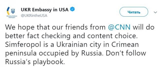 «Мы надеемся, что наши друзья из CNN лучше будут проверять факты и выбирать контент. Симферополь – это украинский город на Крымском полуострове, который оккупирован Россией», – говорится в сообщении посольства в Twitter.