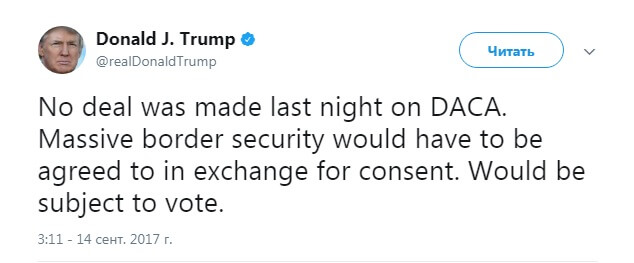 И сам Трамп позже опровег заявление демократов. «Никакого соглашения по DACA прошлой ночью достигнуто не было,» — написал президент в Twitter.