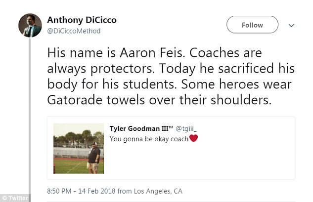 Футбольная команда школы писала в Twitter: «С большой печалью наша футбольная семья узнала о смерти Аарона Фейса. Он был нашим помощником тренера по футболу и охранником. Он самоотверженно защищал учеников от стрелка, когда тот застрелил его. Он умер героем, и он навсегда останется в наших сердцах и воспоминаниях».