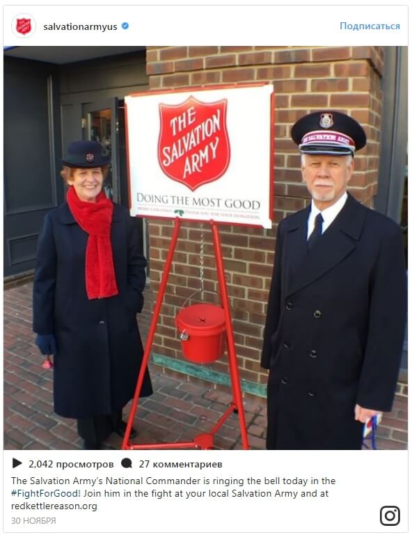 На углу улиц, на входе в магазины стоят волонтеры «Армии спасения» (Salvation Army) в красных шапках Санты с колокольчиками и громко призывают бросить копейку. А их «красные чайники» (red kettles) стали символом сбора пожертвований.