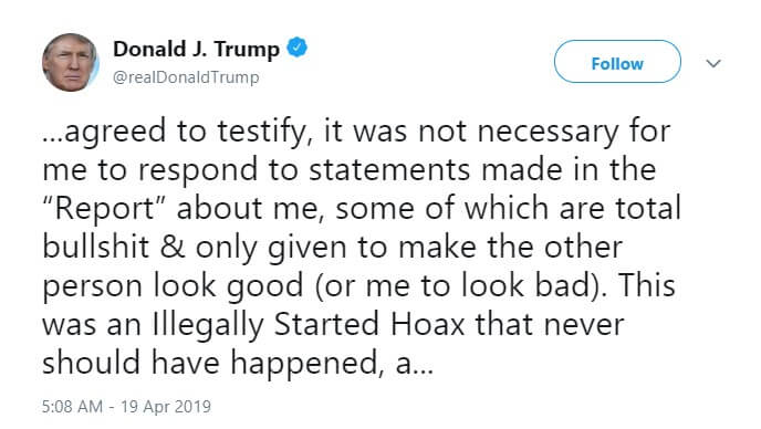 Отмечая, что он отказался дать личные показания Мюллеру (вместо этого он дал письменные ответы), Трамп сказал, что «ему не нужно» отвечать. Он добавил, что некоторые высказывания о нем в отчете «являются полной чушью собачьей — и даны только для того, чтобы другой человек выглядел хорошо (или он выглядел плохо)».