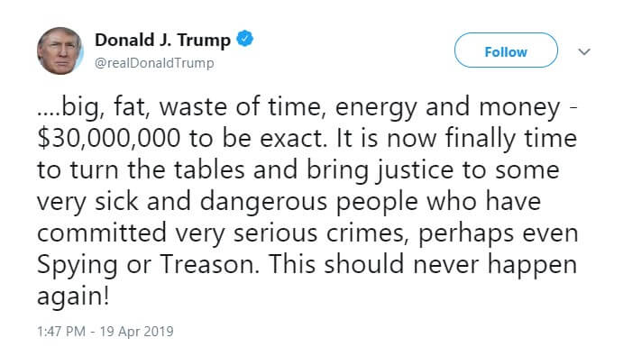 В третьем твите он осудил исследование Мюллера как «большую, жирную, пустую трату времени, энергии и денег»; он также пообещал «восстановить справедливость» в отношении тех, кого назвал политическими врагами, которые изначально начали расследование. Трамп заявил, что они «совершили очень серьезные преступления, возможно, даже шпионаж или измену».