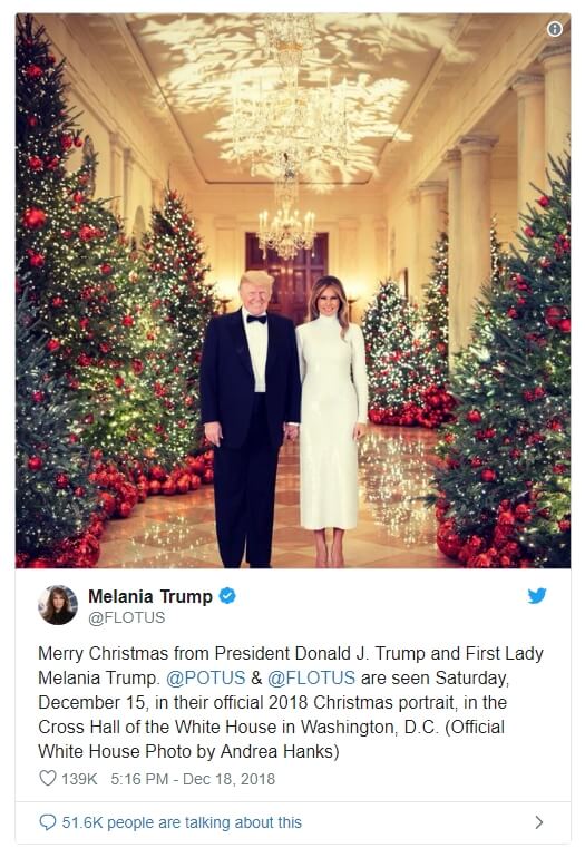 «Счастливого Рождества от Президента Дональда Дж. Трампа и Первой леди Мелании Трамп», — говорится в официальном твите первой леди, опубликованном во вторник, 18 декабря.