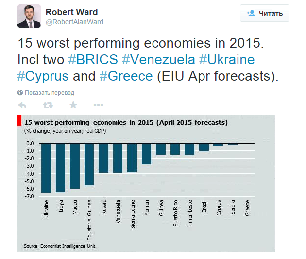Лидером топ-15 оказалась Украина. По данным экспертов, в апреле текущего года ее реальный ВВП снизился более чем на 6% по сравнению с аналогичным периодом прошлого года. За Украиной следуют Ливия (падение ВВП – 6,2%), Макао (6%), Экваториальная Гвинея (5,6%) и Россия (5%).