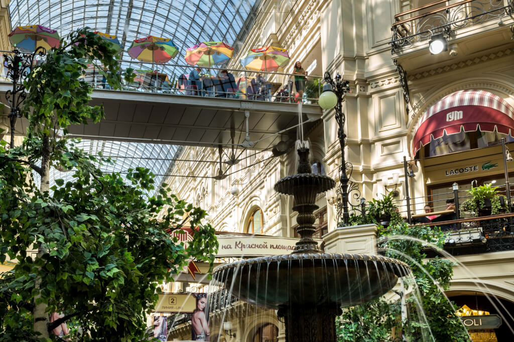 В отличие от типичных современных, элегантных универмагов в США, красивый стеклянный потолок ГУМа пропускает много естественного солнечного света. Живые цветы, зелень и причудливые детали оживляли обстановку, поднимая настроение.